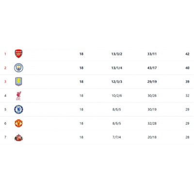Tabellen genomgick subtila förändringar efter denna omgång. Titelkampen liknar nu en trekamp, med Arsenal i täten med 42 poäng från 13 segrar, 3 oavgjorda och 2 förluster, även om deras försprång fortfarande är knappt. Manchester City ligger bara två poäng efter med 40 poäng och är redo att ta över ledningen när som helst. Aston Villa har dykt upp som en outsider i titelkampen med 39 poäng – bara tre poäng efter Arsenal. Med mindre än tre poäng mellan de tre topplagen kan varje matchdag resultera i att ledningen byter ägare, vilket gör titelkampen mycket spännande.